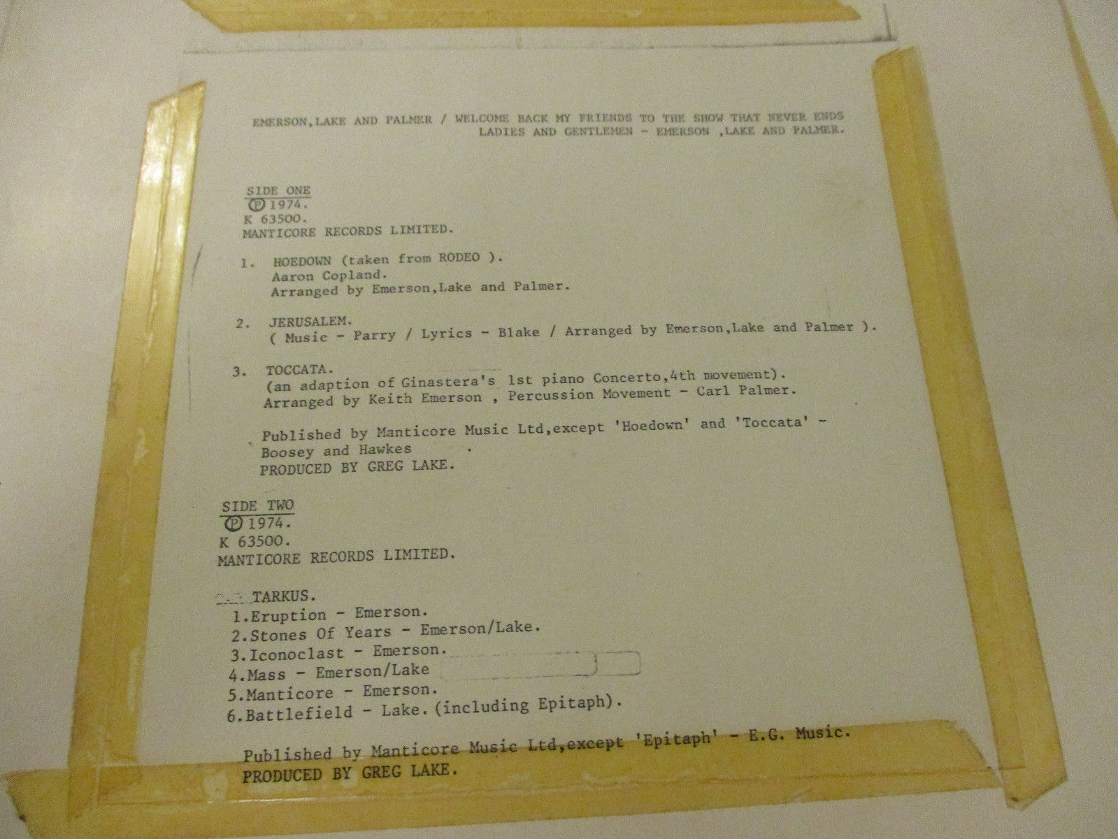 En référence à welcome back my friends to the show that never ends ladies and gentlemen 3xlp album gat k63500 n 63500 63500 my version has discs made in france 63500 and the cover printed in the us mc 3 200 1298.